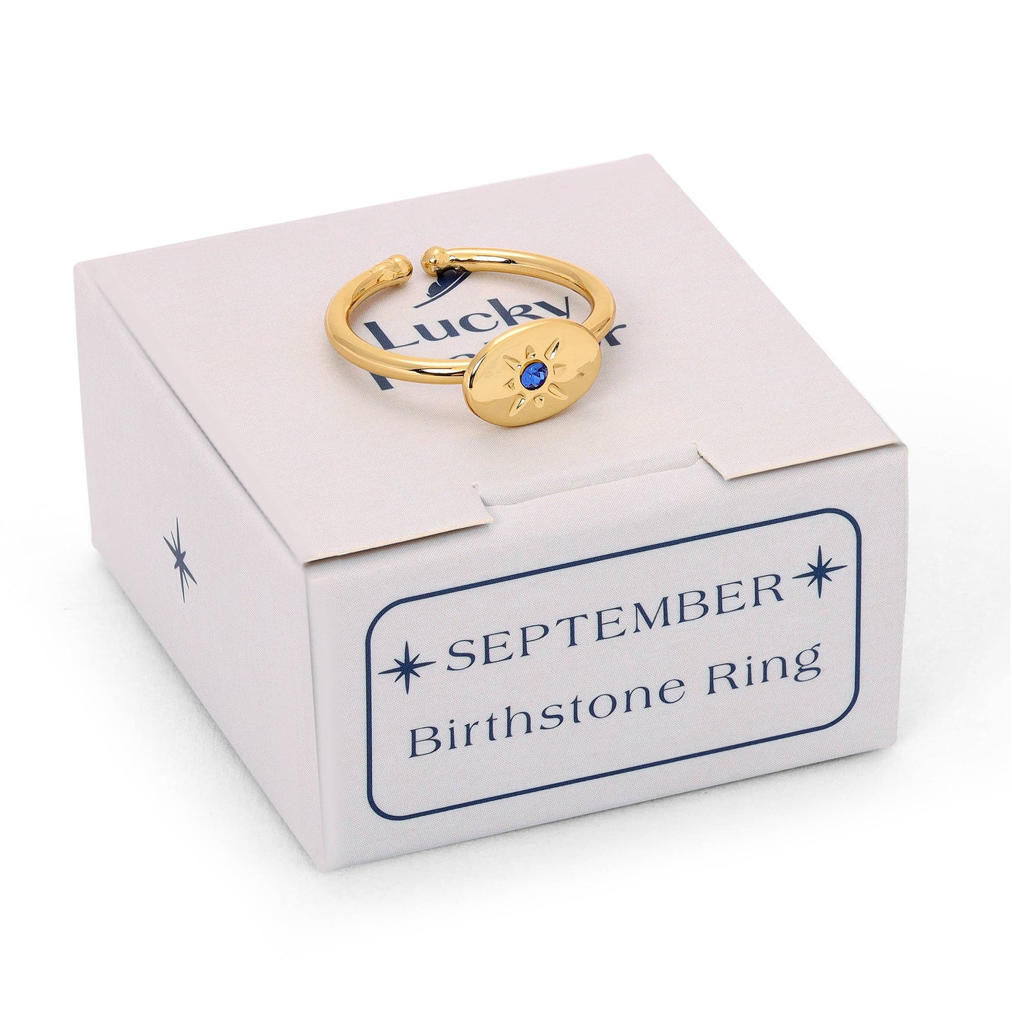The Birthstone Signet Ring Gold - September/Sapphire from Lucky Feather is a celebration of zodiac and birth month themes. As a part of our band-stacked collection, this ring carries a sapphire symbol, representing September's birthstone. Crafted with precision and an eye for detail, this piece reflects the brand's commitment to spreading good energy and inspiration. It's more than just a piece of jewelry; it's a personal statement and a wonderful gift.