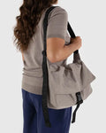 A functional, go-to bag with two large exterior pockets in addition to the main interior compartment. Has an interior laptop sleeve with velcro closure that fits 13/14” laptop in a puffy case.